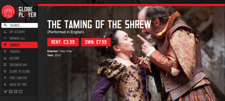 Typical prices are £3.99 (roughly $6.50) for a rental, which lets you stream from your account for 7 days, or £7.99 (roughly $12.75) to purchase a download. You can search by category (e.g. Comedy, Tragedy, History), and many of the big-hitters seem to be on there, including Hamlet and Macbeth.