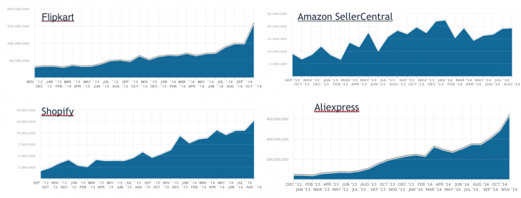 As we can can see from the graphs below, traffic to Flipkart, Amazon Seller Central, Shopify and AliExpress is on the rise.