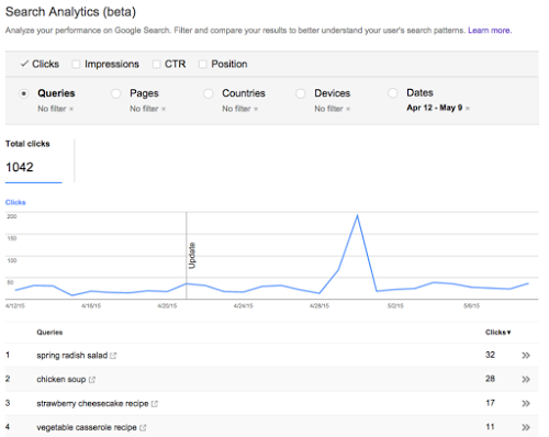 The Search Analytics report lists top queries, top app pages and traffic by country for each indexed app. You can also use filters to drill down to specific query types or regions, or sort by clicks, impressions and click-through rate.