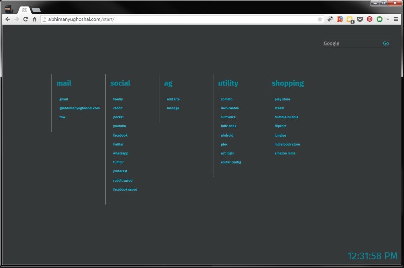 It’s a simple page that just contains a bunch of links in columns, along with a clock and a Google search box. I run mine as a pinned tab in Chrome so it doesn’t take up much room and is always easy to reach with Ctrl/Cmd+1.