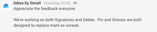 ➤ The Inbox By Gmail Team Is Working On Signatures And Labels, But Don’t Hold Your Breath For Mark As Unread [Android Police]
