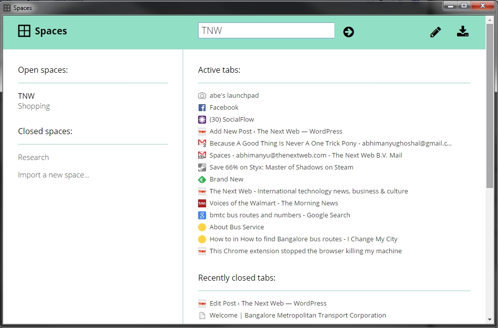 The extension also lets you export each space as a list of URLs in a text file and lets you import new spaces by pasting such a list too. Plus, it remembers your spaces and closed tabs even after you’ve rebooted Chrome.